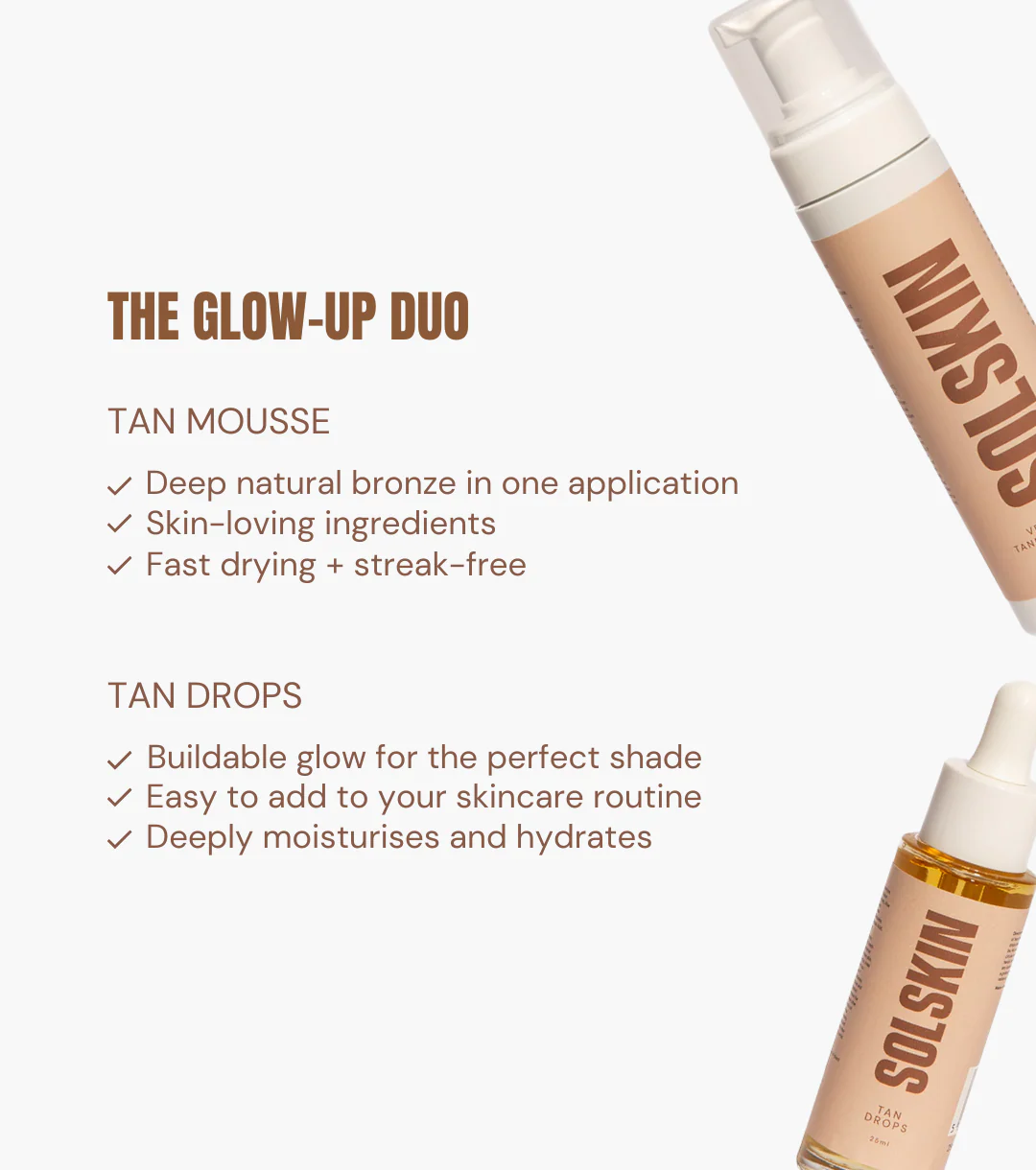 Not your average tan mousse. SOLSKIN Tan Mousse is vegan, cruelty-free & specifically formulated for all skin types (including those with sensitive or eczema-prone skin). Enriched with papaya and ginger extracts and nourishing sodium hyaluronate, SOLSKIN gives a streak-free finish and unrivalled bronzing for your skin.